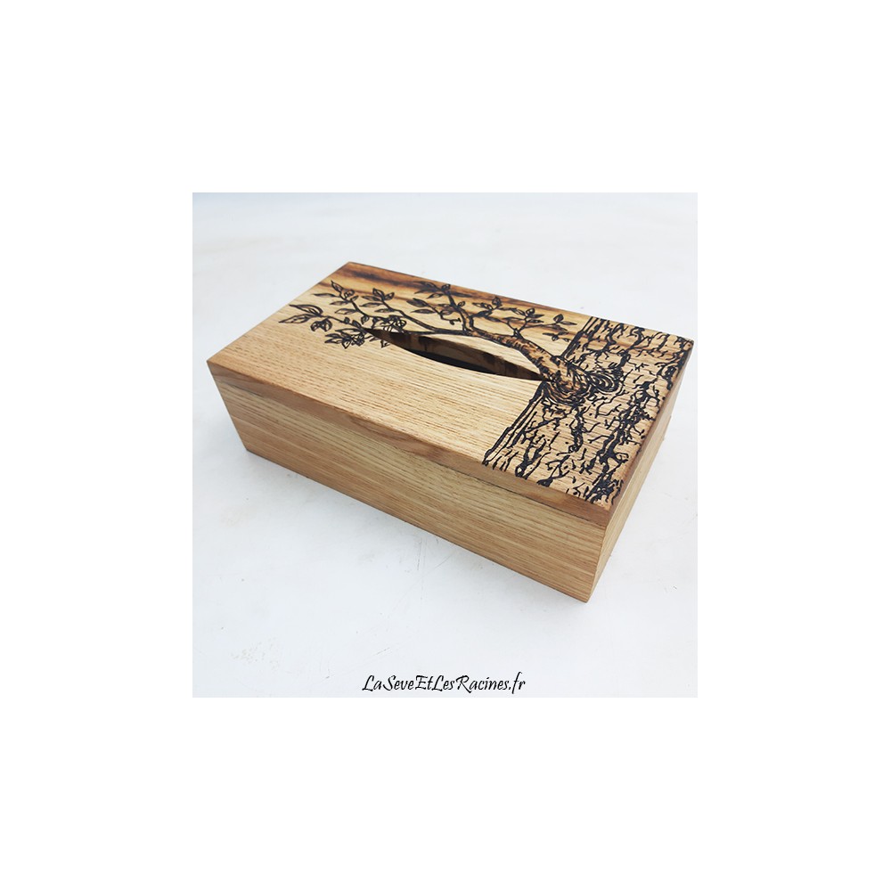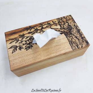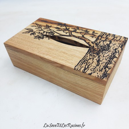 Coffret pour boîtes à mouchoirs de 22,5x12x6 cm (format standard) en bois de châtaignier, pyrogravé branche d'arbre. Pièce unique.