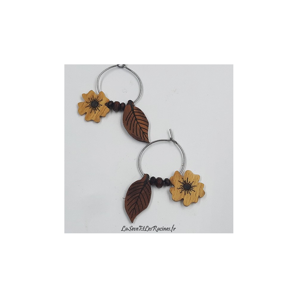 Boucles d'oreilles créoles fleurs et feuilles en hêtre et cerisier