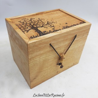 Boîte en bois de châtaignier pour ranger les sachets de graines, pyrogravée arbre et champs.