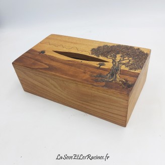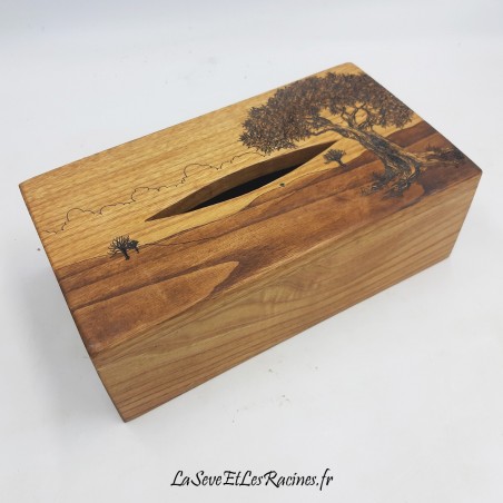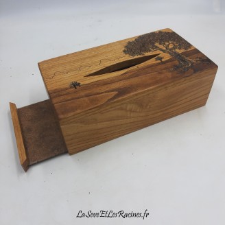 Coffret boîte à mouchoirs de 22,5x12x6 cm (format standard) en bois de châtaignier, pyrogravée arbre paysage.