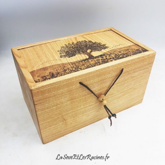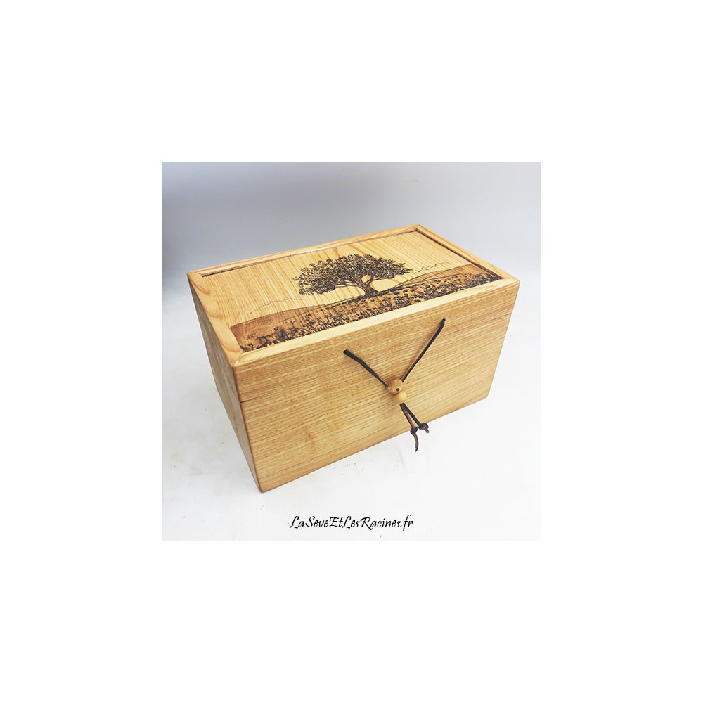 Boîte en bois de châtaignier pour ranger les sachets de graines, pyrogravée arbre et fleurs.