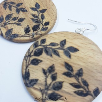 Boucles d'oreilles en bois de hêtre tourné, pyrogravées "feuilles d'arbre", pièce unique