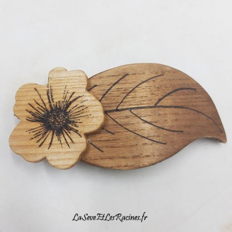 Barrette pince en bois de chêne, pyrogravé fleur et feuille. PIÈCE UNIQUE