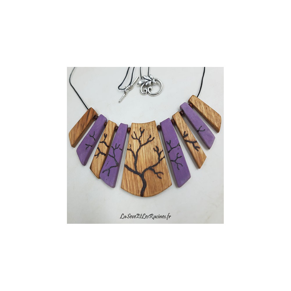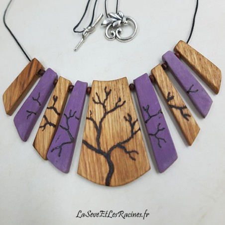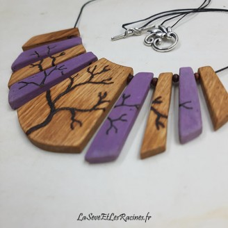 Collier en bois de Châtaignier et céramique pyrogravé arbre