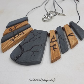 Collier en bois de Châtaignier et céramique pyrogravé arbre