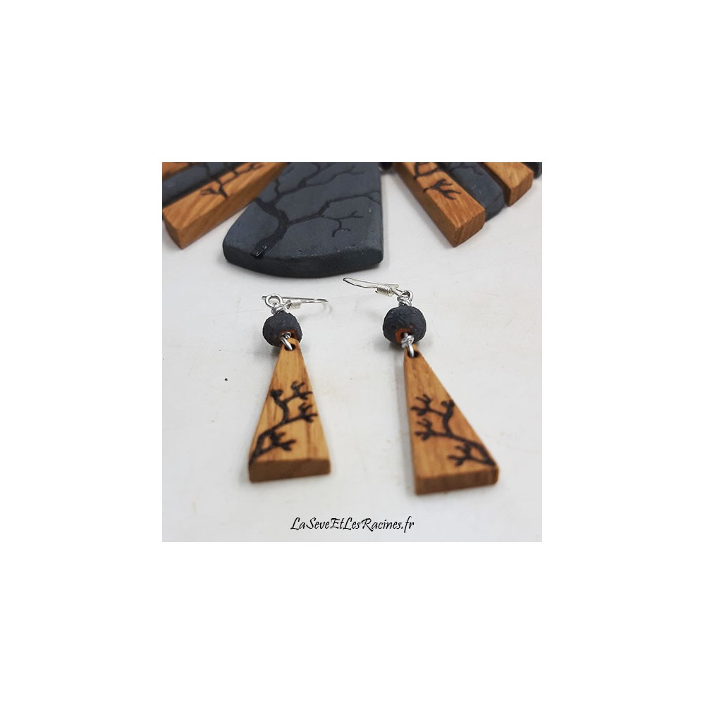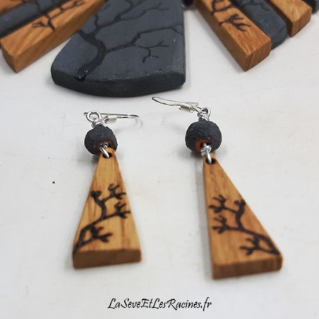 Boucles d'oreilles arbre en bois de châtaignier et céramique bleu-gris