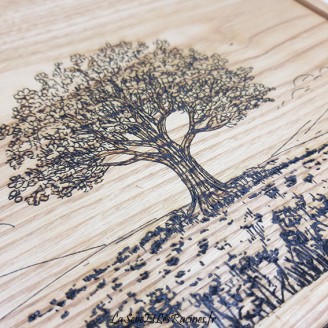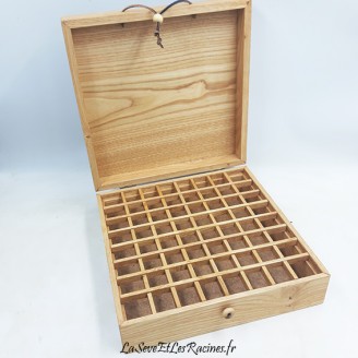 Boîte en bois de châtaignier pour ranger 64 bouteilles d'huiles essentielles. Pyrogravée arbre et champ fleuri, pièce unique